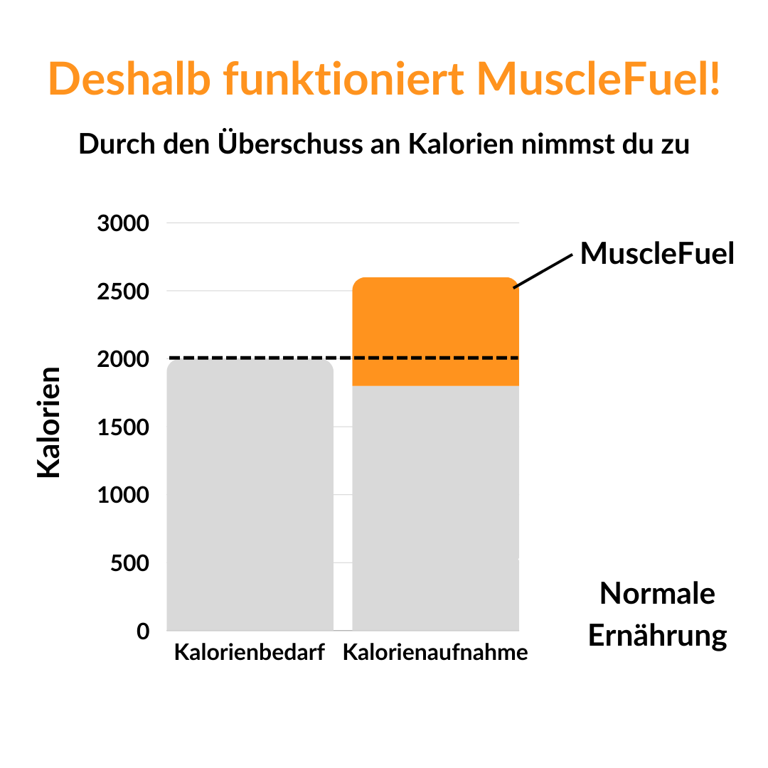 MuscleFuel ist nicht nur ein Kalorienbooster. Dieser speziell formulierte Shake wurde entwickelt, um die einzigartigen Ernährungsbedürfnisse von Personen zu adressieren, die natürlich dünn sind und Schwierigkeiten haben, Gewicht zuzunehmen. Ein täglicher Shake führt zu einem Kalorienüberschuss von etwa 6.000 kcal pro Woche, was fast einem Kilogramm Gewicht entspricht. Dies ist die Basis für effektives Zunehmen. Mit einem ausgewogenen Mix aus Makro- und Mikronährstoffen unterstützt MuscleFuel eine nachhaltige Gewichtszunahme.